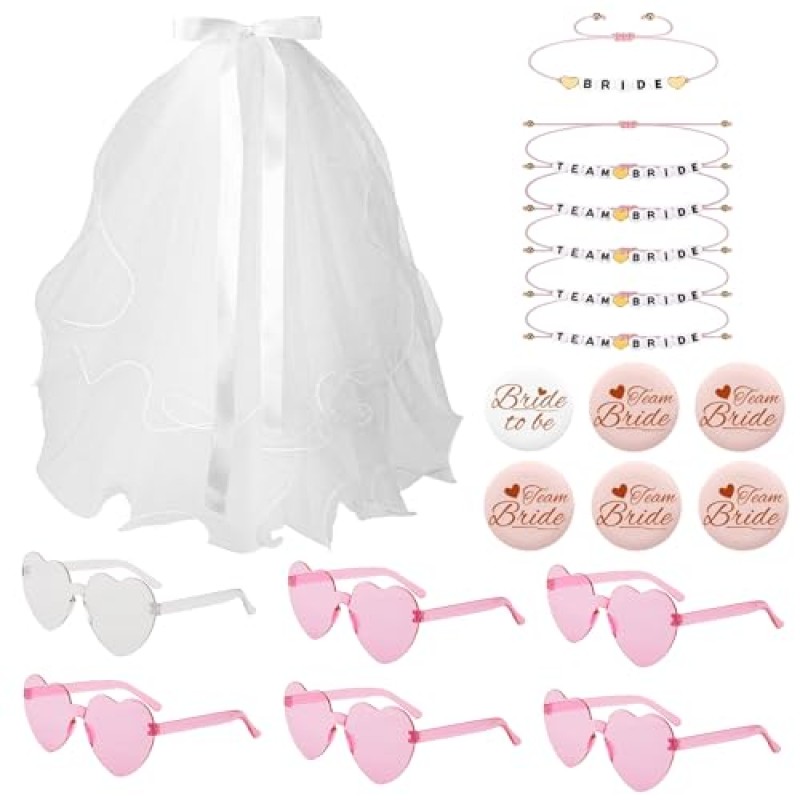 - Contains 19 pieces: hairclip bow veil, 6 braided heart bracelets, 6 pairs of transparent heart glasses, 1 bridal badge, 5 bridal party badges