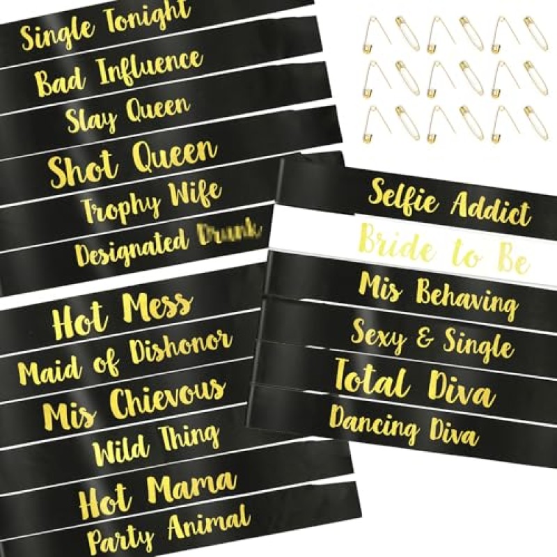 - Includes 18 sashes: 1 'Bride-to-Be' (white) and 17 'Team Bride' (black)