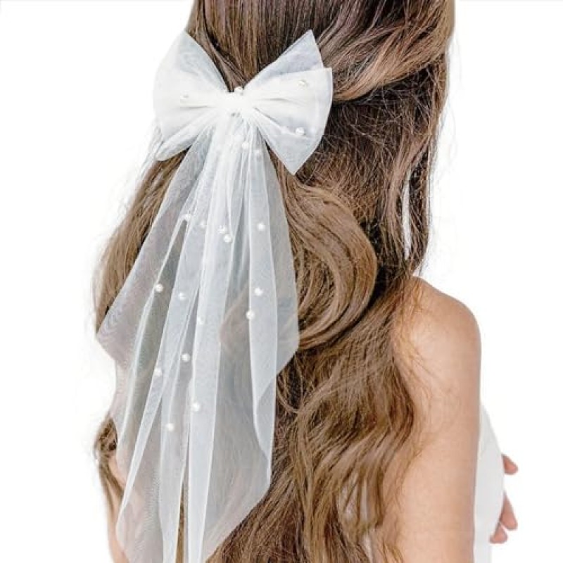This elegant bridal hair bow combines soft white tulle with delicate pearl accents, making it a lovely finishing touch for the bride or her bridesmaids during hen nights or bridal showers. Its short veil style is subtle yet sophisticated, perfect for adding a romantic flair to group celebrations in Yorkshire or beyond. Wearing coordinating accessories can create charming photo moments as the party enjoys a weekend together celebrating the upcoming wedding. The clip design ensures easy styling for quick outfit changes or natural touches throughout the day’s festivities.