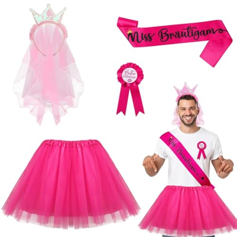 - Includes pink tulle skirt, Miss Groom sash, crown headband, and Best Husband badge