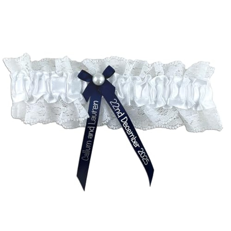 This elegant navy blue garter is a charming addition to any hen do or wedding day, perfectly fulfilling the tradition of 'Something Blue'. Personalised with the couple's names and wedding date in shimmering silver metallic text, it makes a thoughtful keepsake to celebrate the special occasion. The soft, stretchy fabric comfortably fits most sizes, ensuring a lovely fit for the Bride to Be. Finished with a delicate pearl detail on the bow, this garter adds a touch of classic style to wedding celebrations.