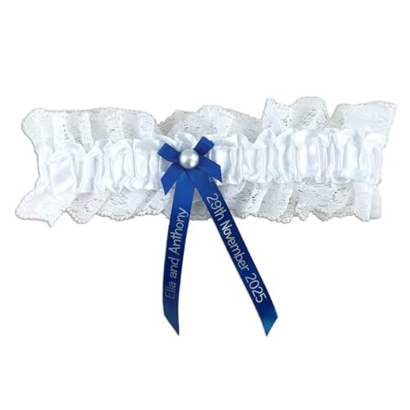 This elegant royal blue garter, accented with shimmering silver text, makes a lovely accessory for the bride to wear on her wedding day or during the hen party celebrations. Personalised with the couple's names and wedding date on delicate ribbon strands, it adds a thoughtful, unique touch to the occasion. Finished with a subtle pearl detail adorning the bow, this garter combines classic charm with a modern feel. Perfect for capturing special moments in photos, it complements stylish hen do outfits and creates a keepsake to treasure after the celebrations. The stretchy fabric ensures a comfortable fit for most, making it suitable for the bride-to-be no matter the plans for your Yorkshire weekend away or local gathering.