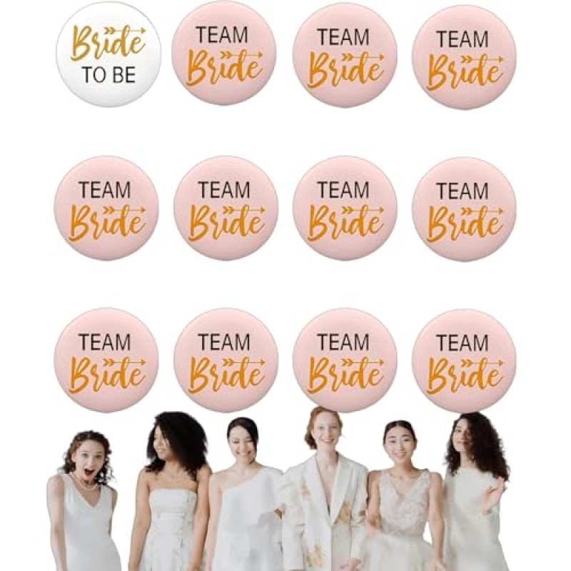 - Contains 12 badges: 1 white bride badge and 11 pink team badges
